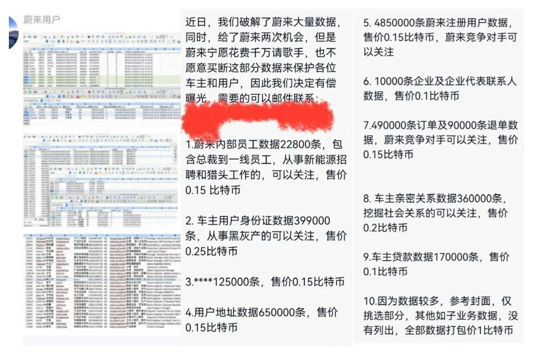 一张流传于网络的图片显示,有人宣称破解了蔚来大量数据,并公开叫价出售。其列出的数据涉及蔚来的经营以及客户隐私,包括蔚来员工数据、订单数据、用户及企业代表联系人数据,还包括车主身份证、用户地址,甚至车主亲密关系、车主贷款数据等极为隐私的信息。