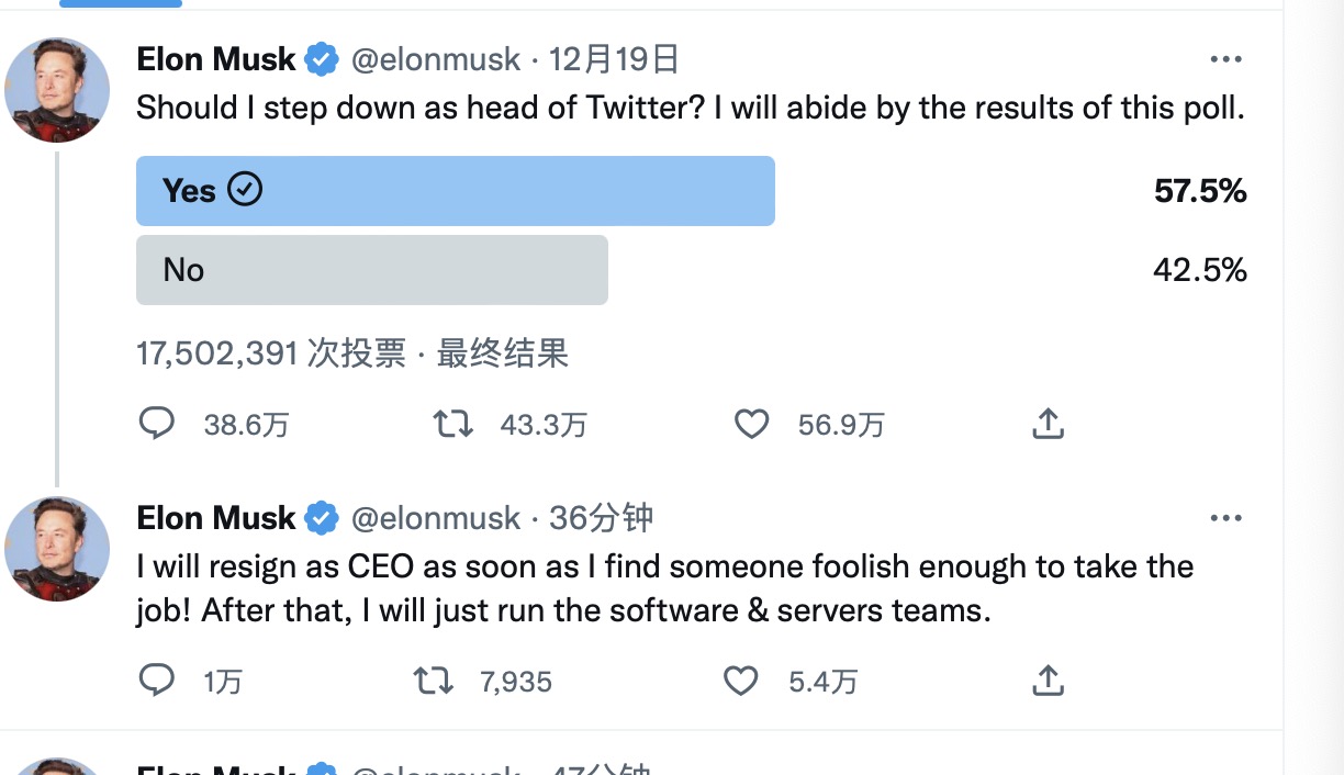 12月19日,马斯克在推特上发起一项投票,询问网友“我是否应该辞去推特负责人一职”,他还补充说,将遵守本次投票的结果。