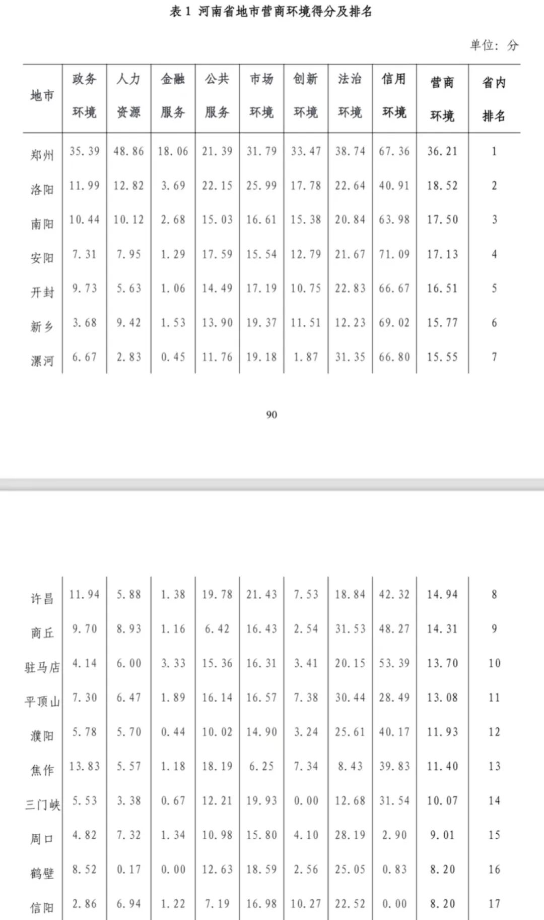 数据显示,郑州营商环境得分相对较高,综合得分为36.21分,其他地级市营商环境得分均位于20分以下。但与全国地市营商环境先进水平相比,河南省地市营商环境水平总体一般。