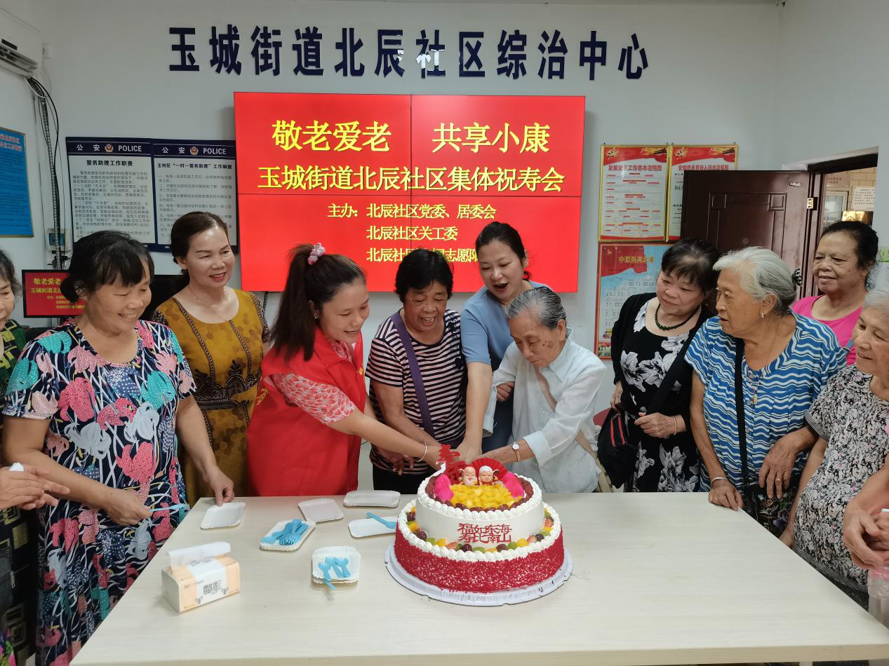 △玉林市玉州区玉城街道北辰社区巾帼志愿“阳光站”的志愿者与老人一起过生日