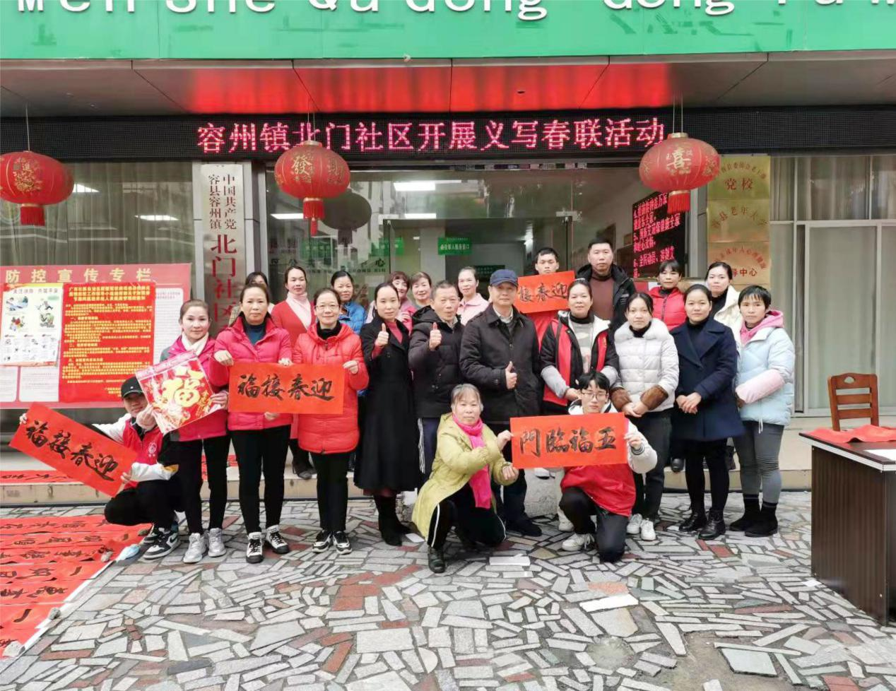 △容县容州镇北门社区巾帼志愿“阳光站”的志愿者们为社区老人们义写春联