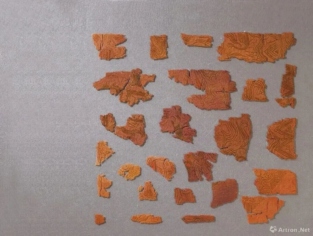 汉《红绢地鸟兽几何纹彩绣残片》 最小残片约0.5平方厘米 最大残片约12平方厘米 马衡1953年捐赠