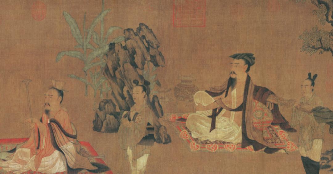 《高逸图卷》为《竹林七贤图》残卷。“竹林七贤”时候魏晋时期的七位名士,此卷仅剩其中四人,经考证,从右至左分别为山涛、王戎、刘伶和阮籍。四人均坐于花毯之上,形态、表情各不相同,四位童子侍立其旁,配合以不同的器物,使人物的个性特征被刻画得惟妙惟肖。除了人物的刻画,孙位对蕉石和器具等衬托物的用笔也费了一番心思,作为点缀山石用到的渲染和皴染手法,开启了五代画法之先河。