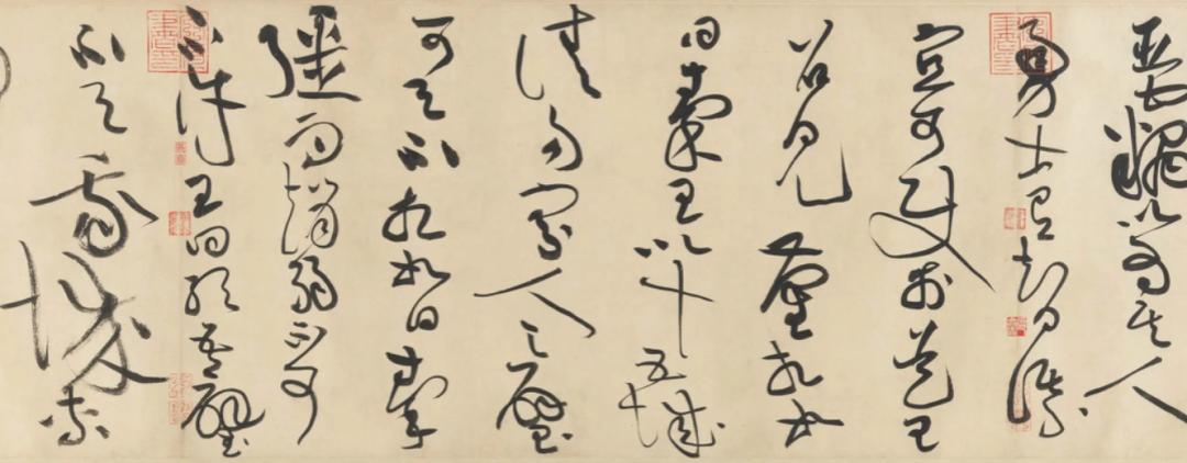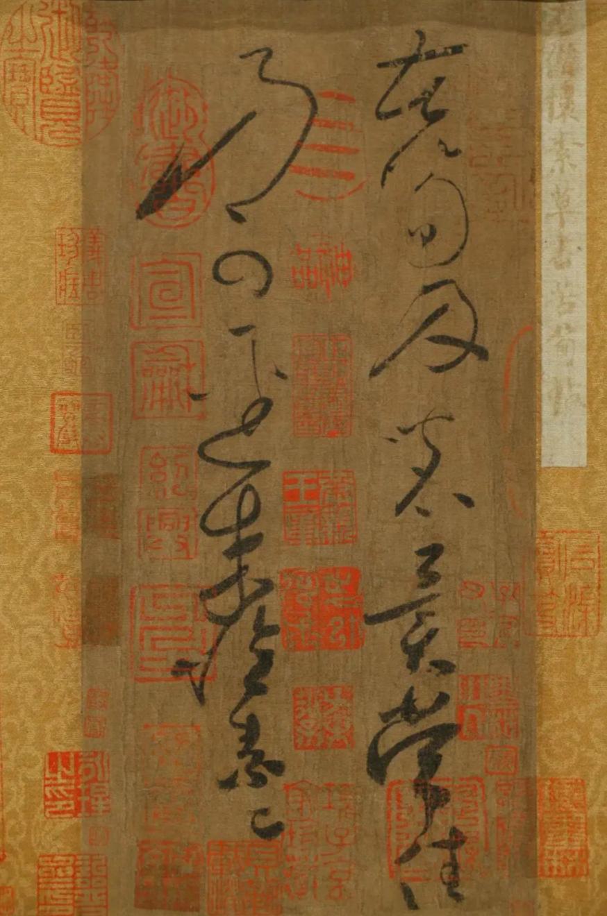 唐 怀素苦筍帖卷 纵25.1厘米,横12厘米《苦筍帖》,是中唐著名草书家怀素传世作品中唯一被大家所公认为真迹的名作。此帖虽只有寥寥14字,却有极高的艺术价值,对于禅宗、茶道等中国传统文化的研究亦具有难以估量的文化价值。