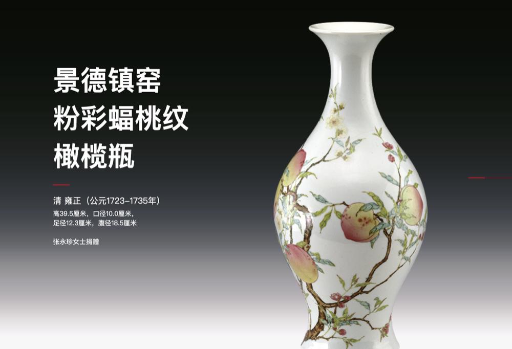 清雍正景德镇窑粉彩蝠桃纹橄榄瓶 清 高39.5厘米,口径10.0厘米,足径12.3厘米,腹径18.5厘米清雍正景德镇窑粉彩蝠桃纹橄榄瓶,曾创下(2002年)清代瓷器拍卖的世界纪录,后由香港收藏家张永珍女士捐赠于上海博物馆。粉彩是清朝雍正彩瓷最著名的品种之一,粉彩蝠桃纹瓷器以盘类居多,在橄榄瓶上极为罕见,此瓶乃存世孤品,所以堪称绝世宝瓶。