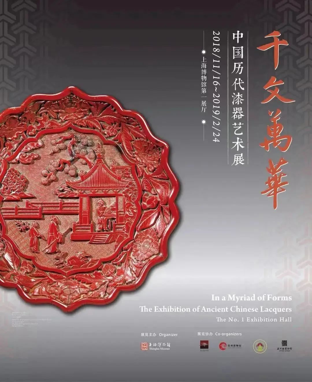 为了深入了解青龙镇的市镇布局和文化内涵,上海博物馆考古部于2010年至2016年对遗址进行了长期考古调研与发掘,逐步揭开了这座湮没于地下数百年的港口重镇的神秘面纱,于2016年12月8日公布了青龙镇遗址考古的重要发现,并开始策划此次展览。展览以115件(组)文物展示上海考古的最新重大发现。千文万华——中国历代漆器艺术展