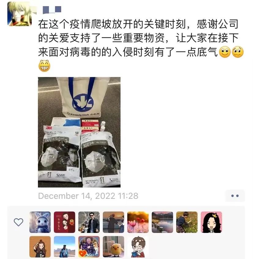 “感谢公司的关爱,及时、温暖,让我们在抵御病毒时有了更多底气!”这些天来,金佰利(南京)个人卫生用品有限公司的员工们纷纷在朋友圈花式秀“爱”——公司给每一位员工发放了包含药品、口罩等在内的“关爱包”。