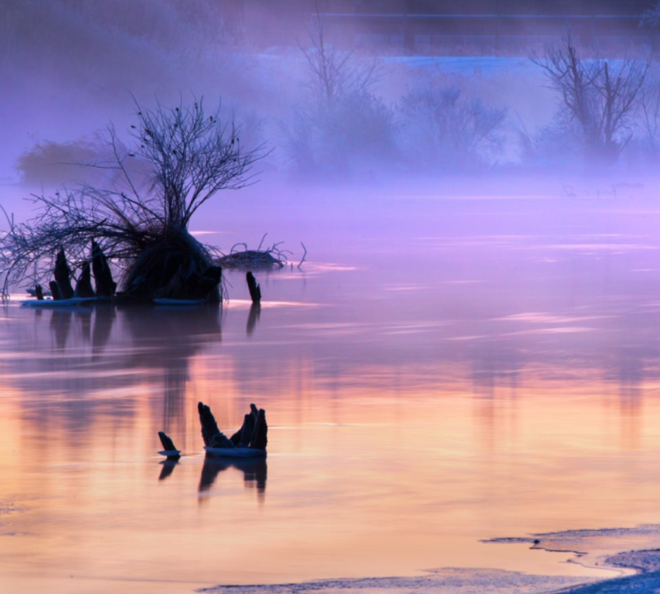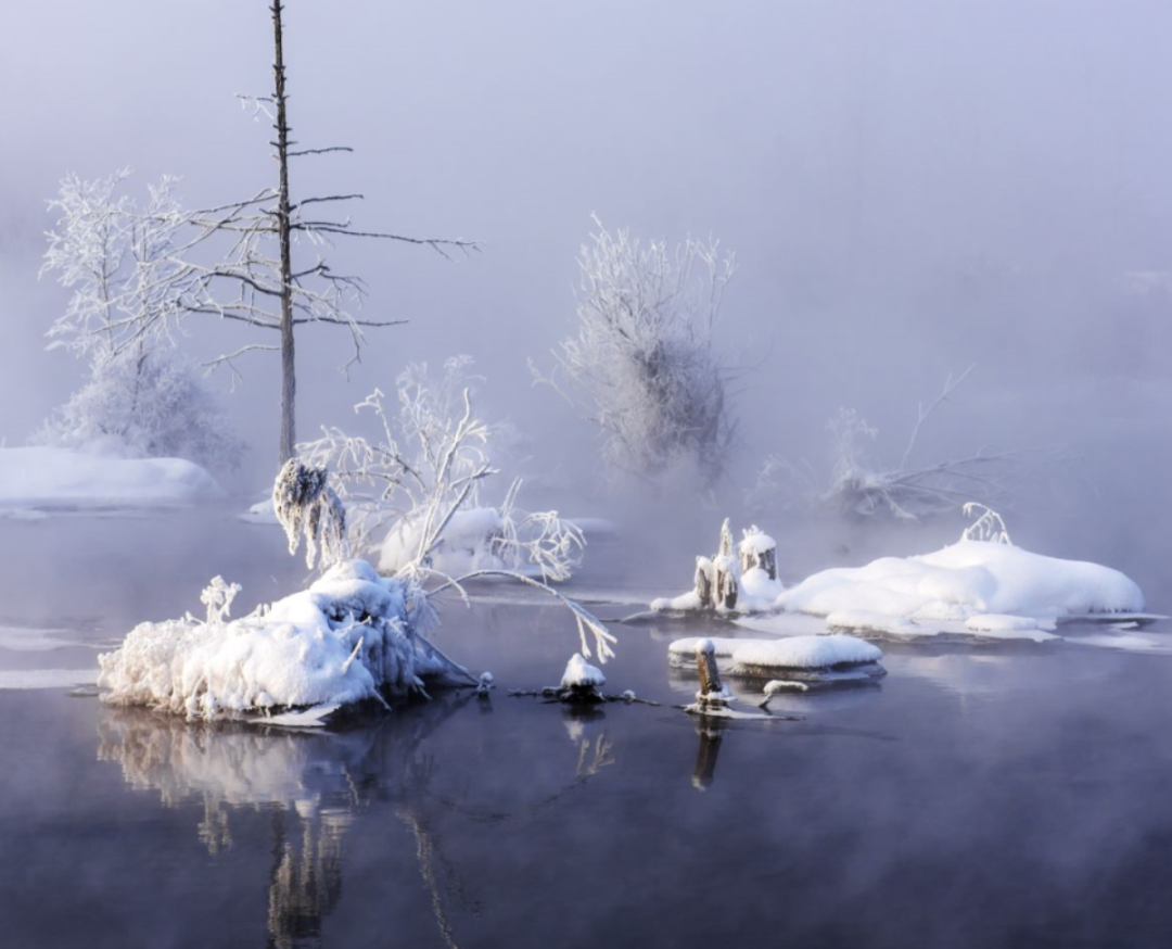 在水汽未散的清晨里,看两岸晶莹的雾凇迎面而来,看水面弥漫起缭绕的雾气,树枝和水波若隐若现,仿佛闯入了亦真亦幻的仙境。