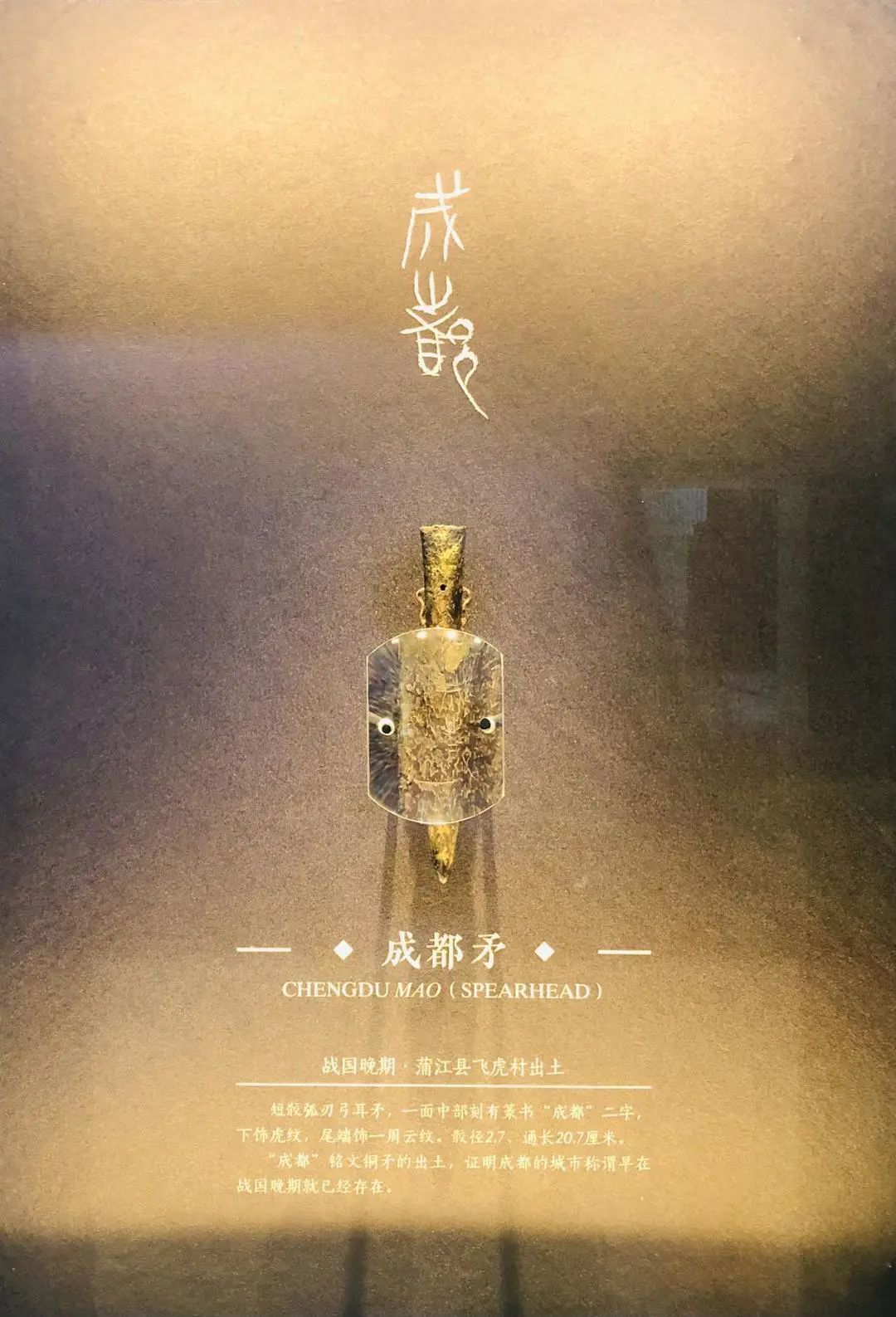 刚出土时的成都矛走近细看“成都矛”,中端前方罩有一面放大镜,观众可以清楚地辨认出上面“成都”二字,或许在那一刻,能真正感受到考古的意义。