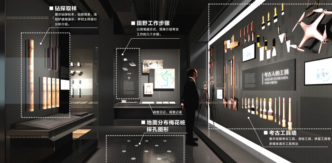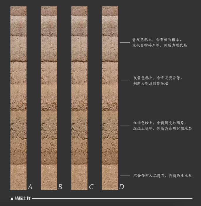 在考古工具墙对面,钻探取样的工具中,还展示了包括“网红”洛阳铲在内的钻探工具,并对土样进行了分析介绍。游客可以清楚了解到,现代层、明清时期地层、商周时期地层、生图层等的特征。