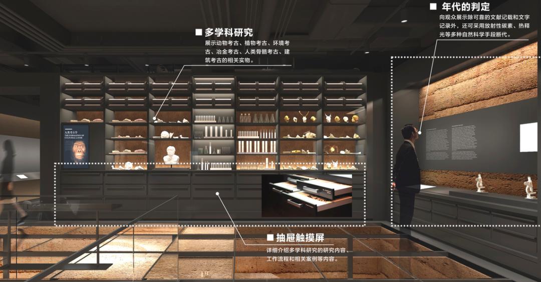 翻面后的文物识字墙拐个弯,来到第二单元“解读过去”中,观众可以详细了解考古学所涉及到的多学科研究,并用一整面墙陈列着动物考古、植物考古、环境考古、冶金考古、人类骨骼考古、建筑考古等相关实物。如果你对某一类型想要了解更深,可以在下面抽屉触摸屏处,了解详细的研究内容、工作流程和相关案例等,为你带来更多知识点。