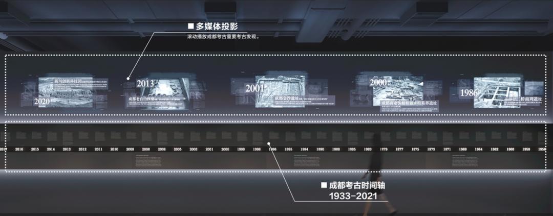 成都市体育中心明代蜀王府发掘现场(摄影:王勤)再经过第四单元“传承天府文脉”探索主建筑研究与复原,了解文化遗产保护和利用后,便可在尾声中看到来自成都市考古研究院多年考古工作的相关照片墙,感知成都考古人穿梭于城市与田野之间的故事。