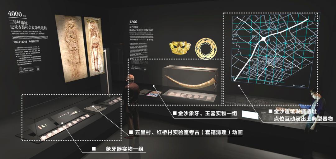 探访古蜀文明在第二部分“考古百年”中,内容开始逐渐丰富起来,有从宝墩遗址、金沙遗址到商业街船棺合葬墓所串联起的古蜀文明;也有老官山墓地、新川科技园墓群、古石山遗址组成的秦汉华章;还有下同仁路江南馆街遗址、东华门遗址等再现锦城盛景。似乎都试图通过考古告诉观众,成都,如何而来。