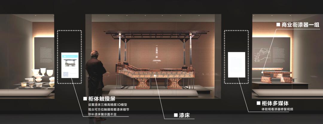最早,“漆”字出现在《诗经》里时,并没有三点水的偏旁。它一木、一人、一水的结构,形象表现出割树取漆的场景。而成都漆艺,发轫于商周,兴盛于春秋、汉唐,绵延至两宋、明清,迄今已达三千多年。据推测,这件战国漆床可能是最后一代蜀王的墓葬,经历过约2400年的风霜,已经十分脆弱,在出土后,文保人员花了十多年时间对其进行保护修复,才最终让漆床以原来的面貌呈现在公众眼前。除此之外,更令人惊喜的是,在战国漆床旁,还有一块多媒体触摸屏,观众可以通过触摸屏上高精度3D模型,全方位观看漆床的细节,充分弥补实物展示面的不足。