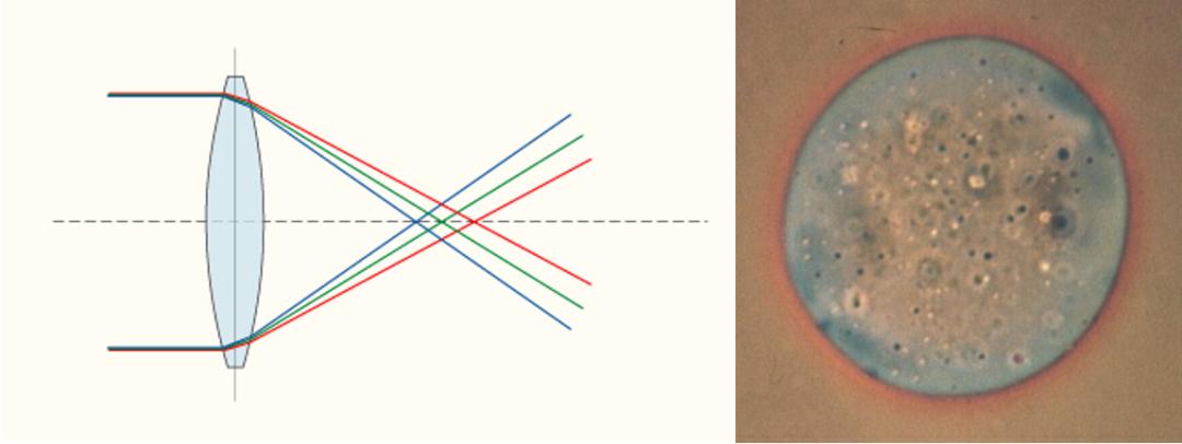 如下图所示,绝大多数光学玻璃,对红光偏折能力弱,对蓝紫光的偏折能力强,也就是对红光的折射率低,而对蓝紫光的折射率高。用具有色差的显微镜观察细胞时,观察到的细胞呈现出外圈红色、中心蓝绿等现象,这也就是我们要说的色差(Chromatic Aberration)。