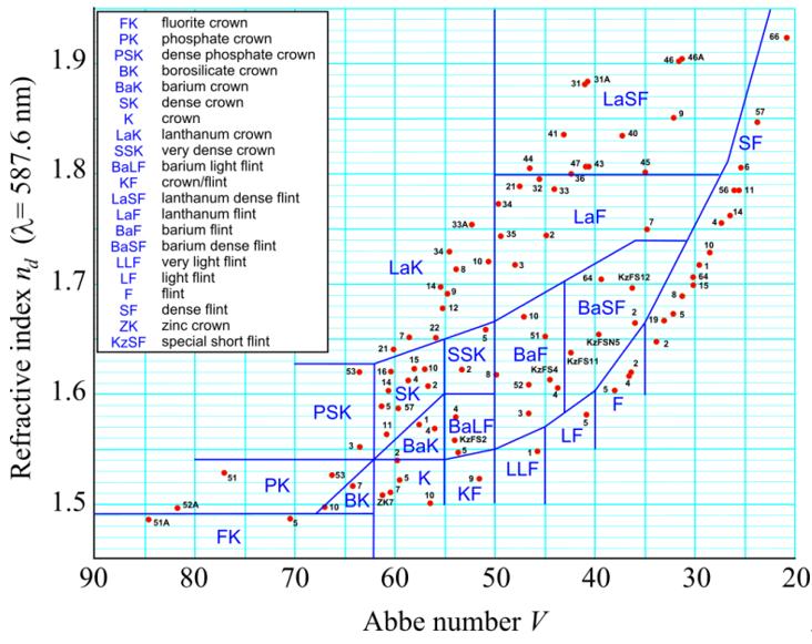 后来,随着玻璃种类的增多改用折射率和色散系数划分,冕牌玻璃折射率通常小于1.6,色散系数(也称阿贝数,数值越大,色散越小)大于50,火石玻璃则相反。