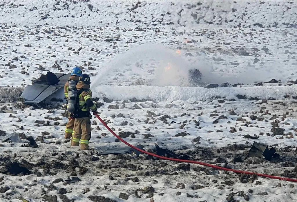 “KA-1”轻型攻击机坠机,消防人员在现场灭火。图丨韩江原道横城郡消防署据韩联社消息,韩国联合参谋本部26日称,韩军从当天上午10时25分起在京畿道金浦前沿军事分界线(MDL)以北捕捉到多条不明航迹,在识别为无人机后多次进行广播示警和射击示警,并投入战斗机和攻击直升机等进行追击。