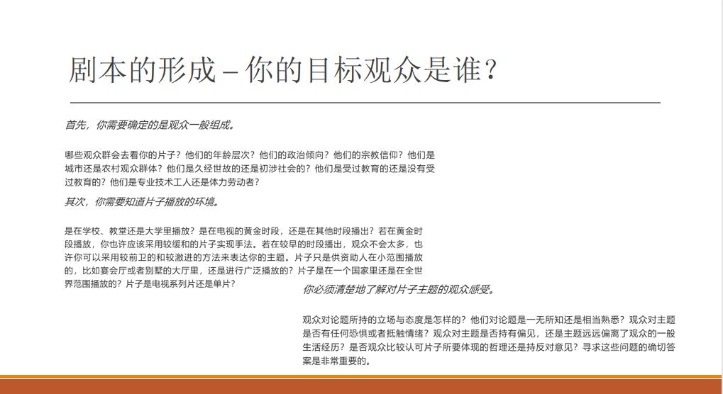 为什么我们要拍这部片子?这是一个好故事吗?这实际吗?这可行吗?这个故事能达到应有的震撼力和吸引力吗?需要很多经费吗?观众的覆盖面和受众群如何?采用何种手法来表达主题?