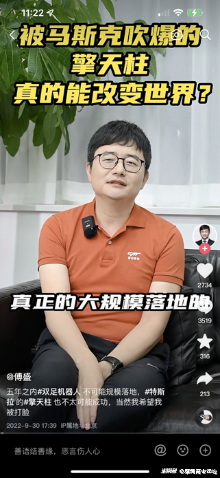 在“擎小柱”发布前夕,曾与马斯克交流过的傅盛发了一条自拍抖音,发表观点认为: