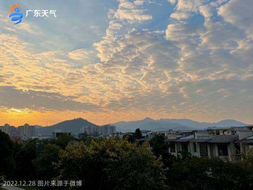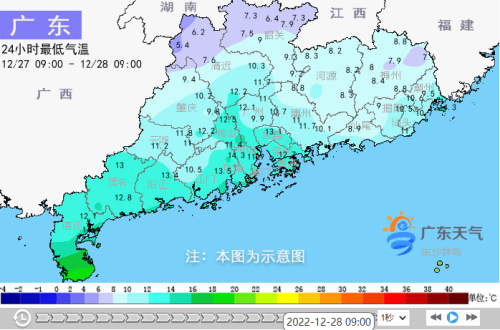 预计28日夜间-29日,受弱冷空气伴有切变线南压影响,广东大部市县短暂时间转阴冷天气;30-31日,广东又转天晴干燥天气,昼夜温差大,早晚寒冷。28-30日,各地日平均气温将下降1~3℃,粤北部分市县有低于5℃的低温,海面风力加大到6级~8级。注意防寒保暖和室内外用火安全;注意海上交通和作业安全。天气实况:27日白天到28日早晨,韶关北部、清远北部、肇庆北部市县多云间阴天,受云量增多影响,最高气温较26日下降了1~4℃;其余市县晴到多云,最高温度与27日持平或略有上升,其中茂名信宜录得全省最高气温24.1℃。28日早晨广东最低气温:粤北市县5℃~8℃,其余市县9℃~13℃,其中韶关仁化录得全省最低气温5.4℃。