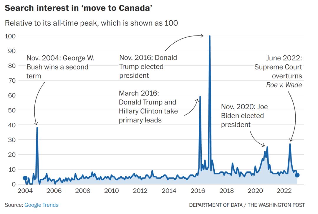 在2004年小布什连任,2020年拜登当选,还有2016年特朗普当选后,美国人在谷歌上搜索移民加拿大的都剧增。6月美国最高法院推翻了在全美范围内堕胎保护的裁决“罗伊诉韦德”案后,这种情况再次发生。