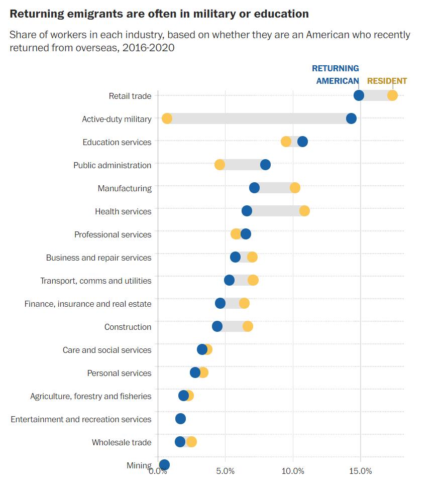 目前还没有关于这些海外美国人从事何种工作的数据。人口普查局追踪返回美国本土的美国人的调查显示,他们更有可能是现役军人,也更有可能在公共管理或教育领域工作,但在卫生、制造、零售或建筑领域工作的可能性较小。