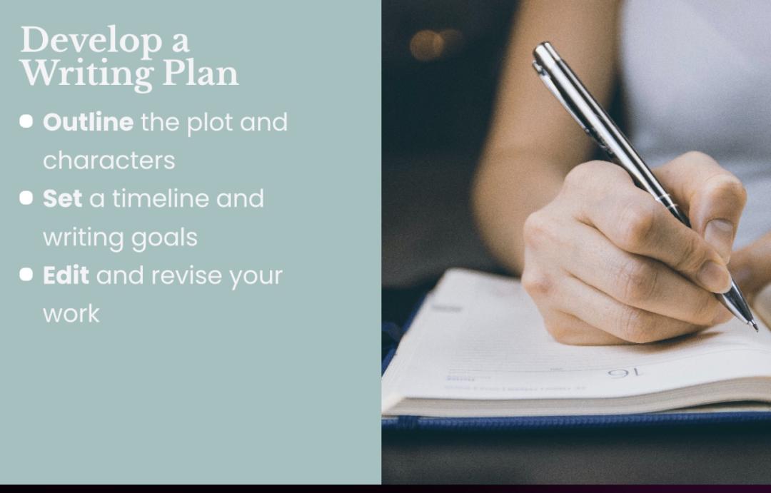 其中,每个部分又在 PPT 中具体展开,比如制定写作规划又被展开成:构建写作蓝图与基本人物、设置创作时间线和目标、编辑调整书的内容细节。