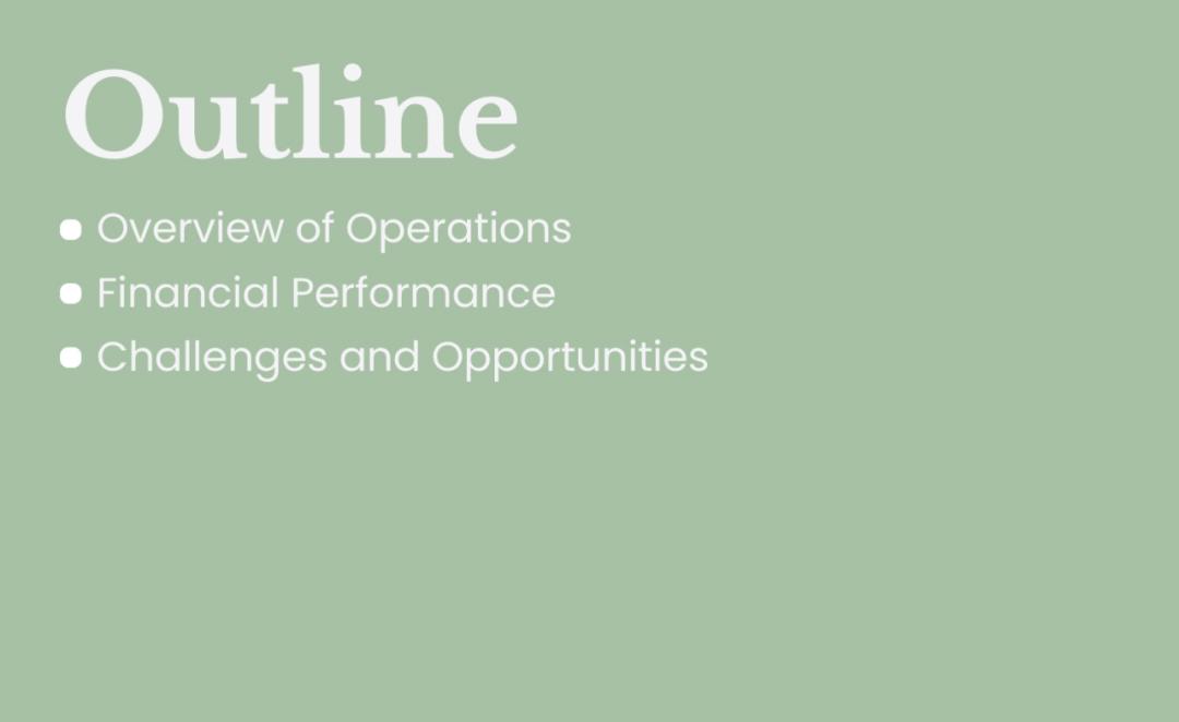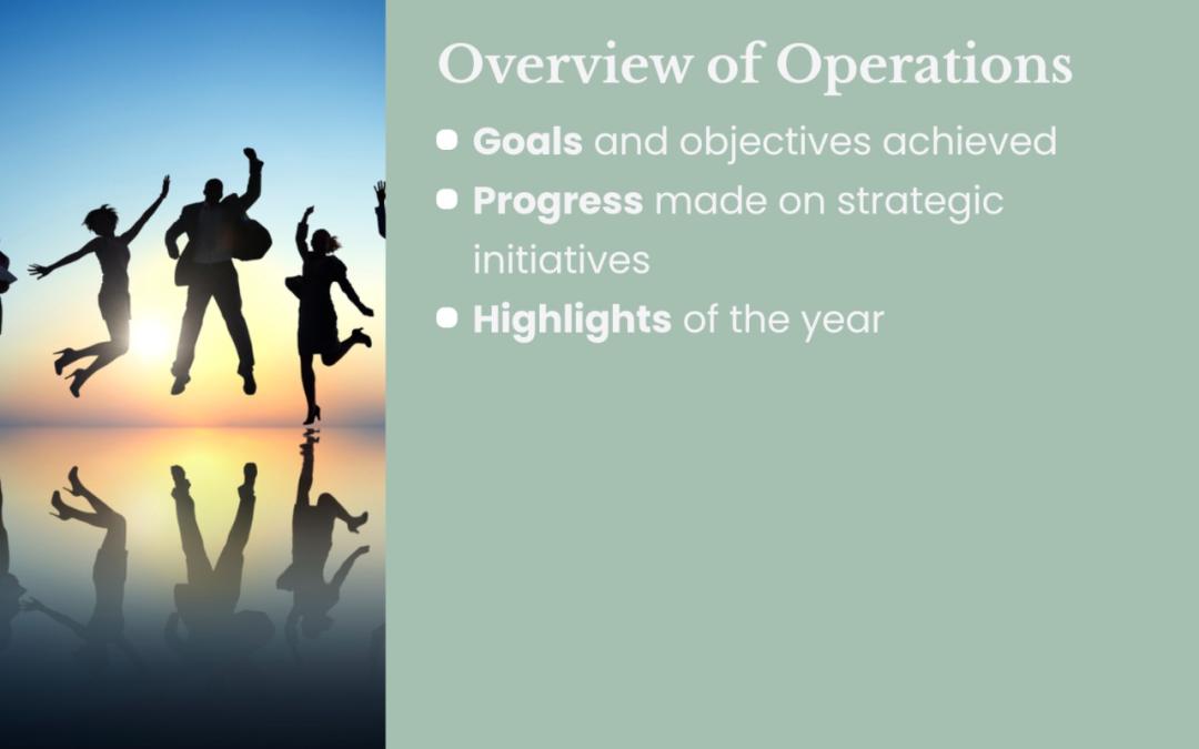 以「运营概况」部分为例,PPT 内容被细分为:1. 计划目标和已实现目标,2. 取得重要进展的项目,3. 年度亮点。