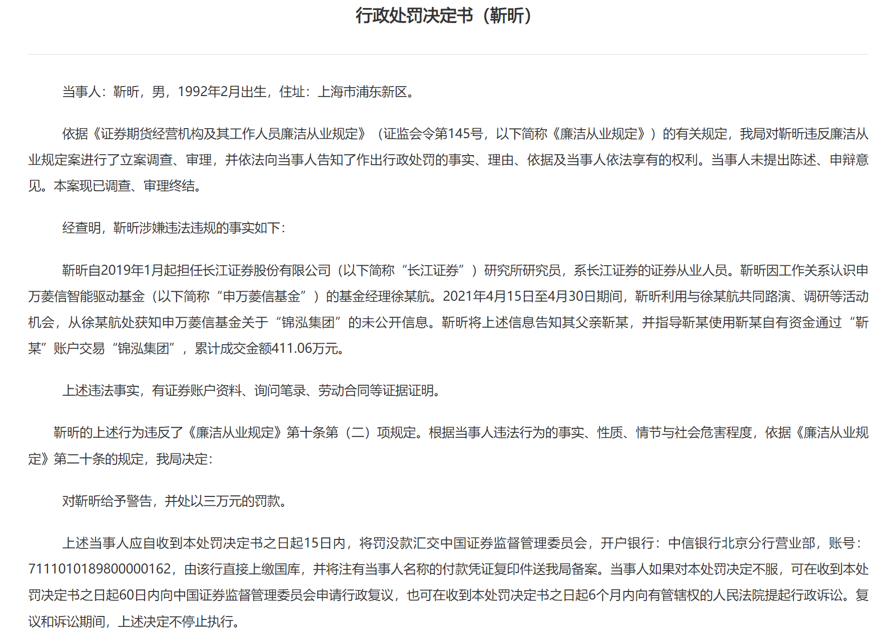 另一则行政处罚书显示,靳昕自2019年1月起担任长江证券股份有限公司(下称“长江证券”)研究所研究员,系长江证券的证券从业人员。靳昕因工作关系认识申万菱信智能驱动基金的基金经理徐某航。