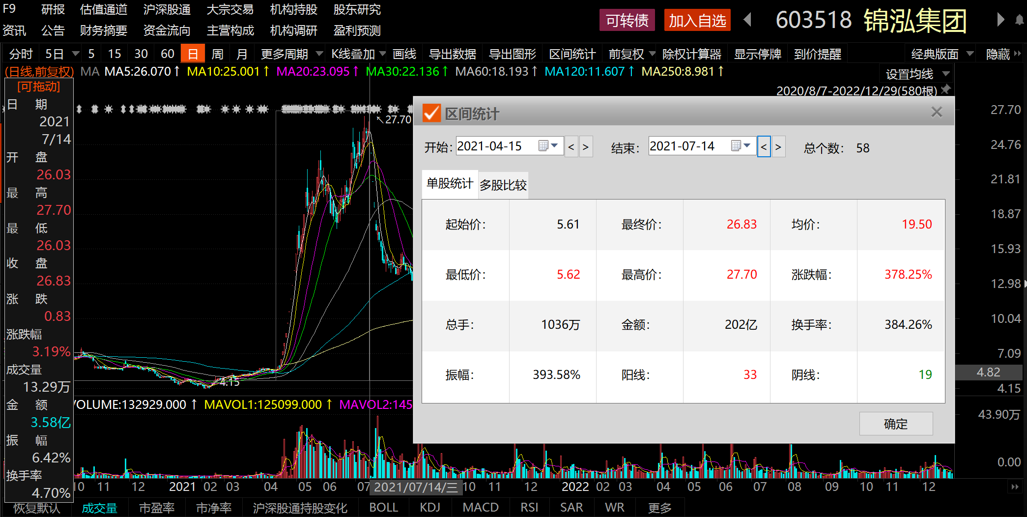 2021年7月14日,锦泓集团股价最高涨至27.7元/股。东方财富Choice数据显示,2021年4月15日至7月14日,锦泓集团股价区间涨幅高达378.25%。