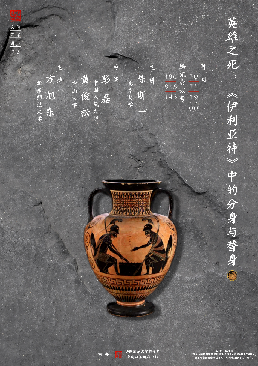 2022年10月15日晚,由华东师范大学哲学系文明互鉴研究中心主办、华东师范大学哲学系协办的“文明互鉴系列讲座”第三讲在线上召开,主题为“英雄之死:《伊利亚特》中的分身与替身”。北京大学哲学系宗教学系陈斯一主讲,华东师范大学哲学系文明互鉴研究中心主任方旭东主持,中山大学博雅学院黄俊松、中国人民大学文学院彭磊与谈。