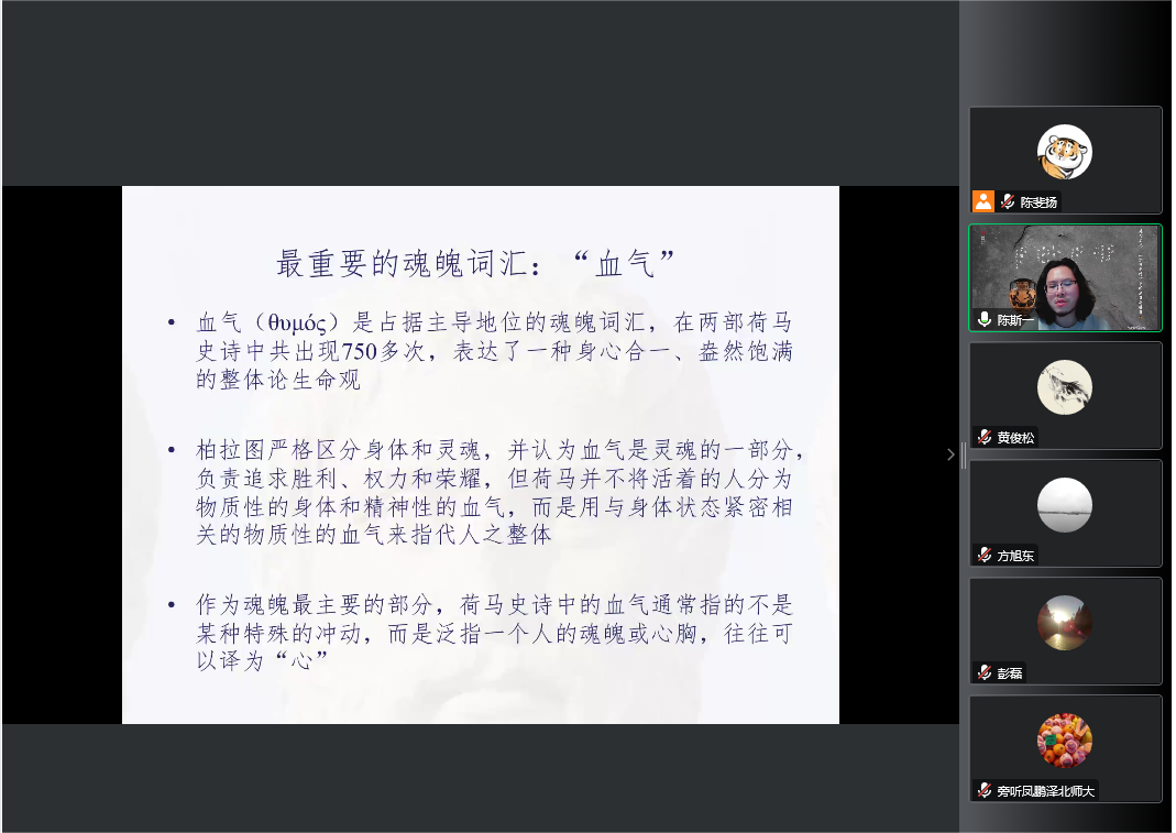 主持人方旭东老师也提出了一些问题。如果荷马所说的“血气”是“自我”,那么这个“血气”是否包含了意识的部分?陈老师回应道,荷马在这一问题上的表述是复杂的。在荷马的论述中,人生前“血气”的确负责思维;但在死后,思维的功能似乎就交给了“灵魂”,而“灵魂”在生前似乎什么也不做。这里的确存在一个“生死断裂”,但这也许正是荷马想要表达的东西,即生时浑然一体,但生死截然有别。此外,生前思维和意识的中心的确都是“血气”,即是我们的“自我”。然而荷马在此有些矛盾:人死亡时,负责思维和意识活动的“血气”也会飘散;但即使只剩下这个冷冰冰的尸体,荷马也会用“自身”来指称它。陈老师解释道,荷马可能宁愿承受这个矛盾,也要凸显出“灵魂”(ψυχάς)和“自身”(αὐτούς)的区别。