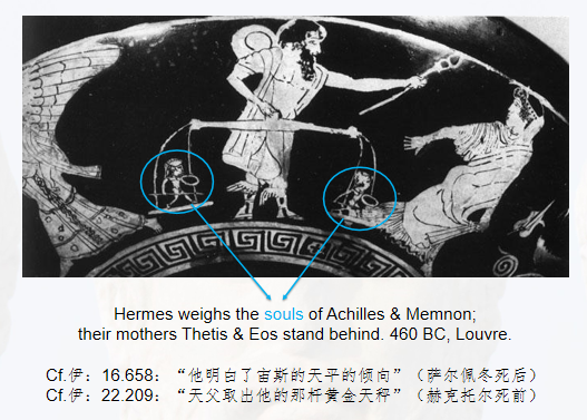 这是公元前460年一个陶瓶上的绘画,绘画内容是赫尔墨斯用命运之秤称量阿基琉斯和门农灵魂的重量,表现了阿基琉斯和门农的对决,谁的灵魂重谁就会死;背后站的是他们各自的母亲,忒提斯和艾俄斯两位女神。陈老师指出,这里的天秤是非常重要的意象,荷马特地在《伊利亚特》中留下了相关的词句,希望让人们明白他对于门农故事的借鉴。为何荷马要选择门农的形象来进行创作?门农是埃塞俄比亚国王,特洛伊的同盟;他的武力和德性都很高;他和阿基琉斯一样是女神所生,极其俊美。根据《厄提俄皮斯》,在特洛伊战争中,门农杀死了涅斯托尔的儿子、阿基琉斯的好友安提洛科斯,但不愿意伤害年老的涅斯托尔,阿基琉斯杀死他为好友复仇。门农死后,忠诚的埃塞俄比亚战士守护他的尸体,他们后来变成鸟,守护他的坟墓,黎明女神的眼泪化作晨露。