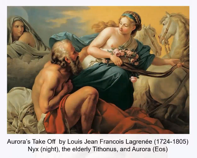 老年提托诺斯与永远年轻的黎明女神艾俄斯,左侧为黑夜女神。艾俄斯将鲜花洒向大地,标志着黎明的到来,而左侧的黑夜女神自然退场。黎明和黑夜的交替意味着时间,而提托诺斯则在永恒的生命中逐渐衰老。