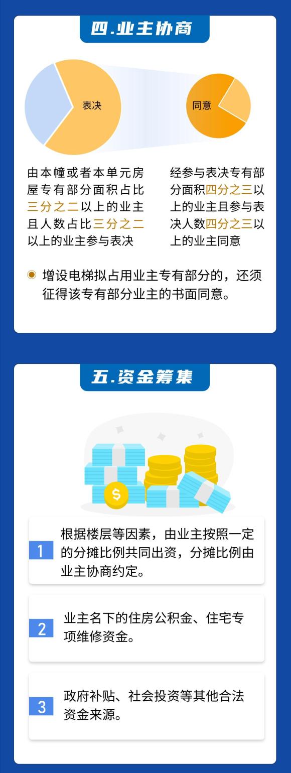 调整业主表决同意比例方面,《办法》规定,“增设电梯应当征求本幢或者本单元全体业主意见,由本幢或者本单元房屋专有部分面积占比三分之二以上的业主且人数占比三分之二以上的业主参与表决,经参与表决专有部分面积四分之三以上的业主且参与表决人数四分之三以上的业主同意”,降低了增设电梯业主表决同意的门槛。
