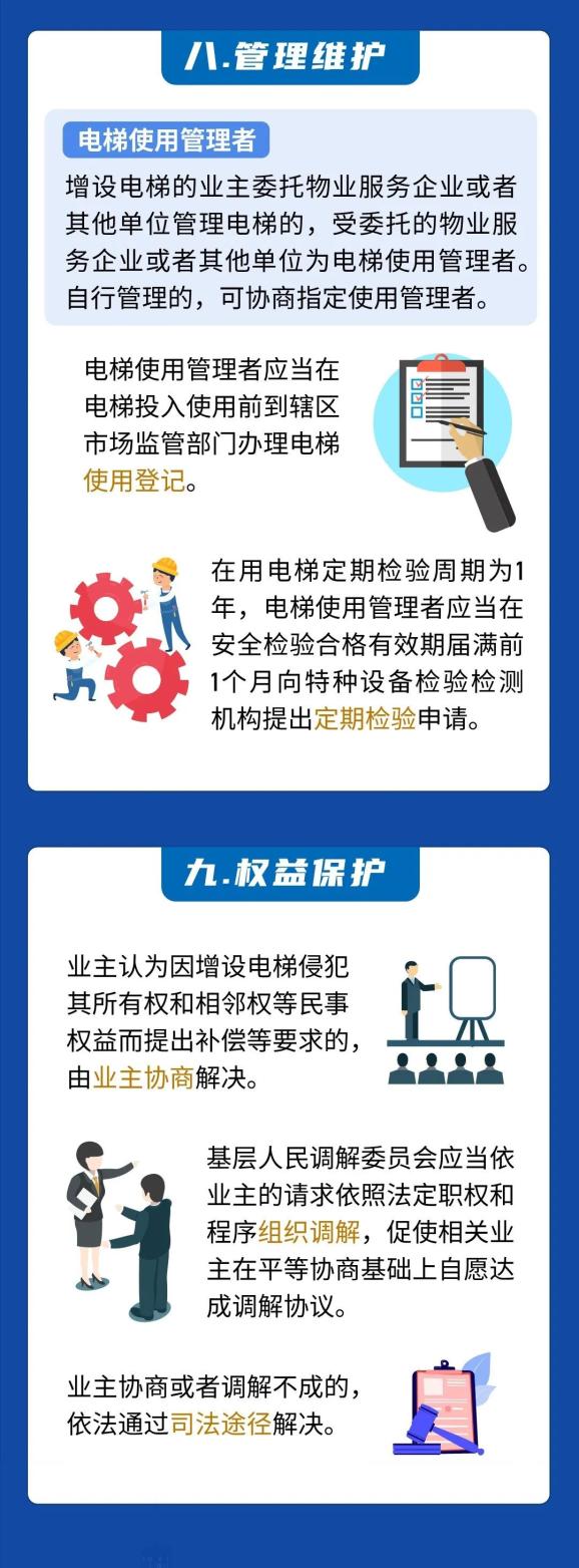 健全联动机制方面,《办法》规定,县(市、区)人民政府应建立增设电梯的协调工作机制,明确相关部门和单位的职责;镇人民政府、街道办事处负责本辖区增设电梯的前期咨询、政策宣传、业务指导、民意协调、纠纷调解和组织实施等工作;社区居民委员会、小区业主委员会、物业服务企业协助镇(街)开展增设电梯相关工作;供水、排水、供电、燃气、通信等管线运营单位应当就增设电梯工程提供技术服务,并支持、配合做好管线迁移改造工作。