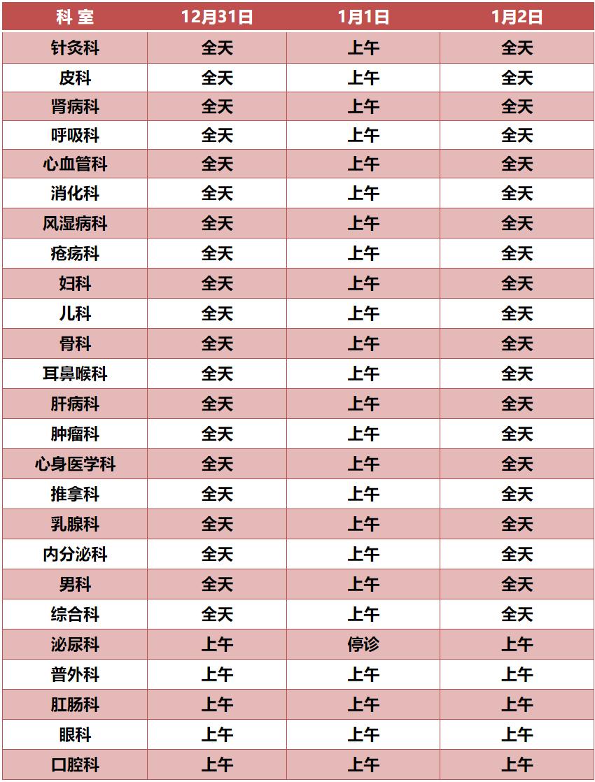 2、康复医学科:12月31日上午半日,开设门诊及部分治疗;