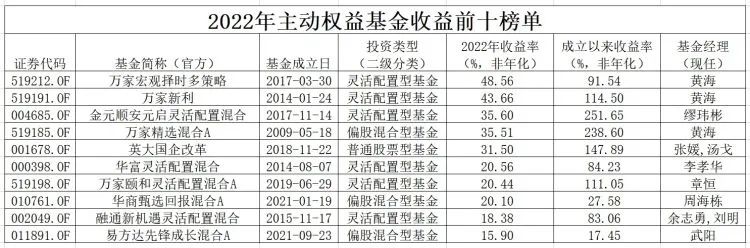 前十名中,有4只产品来自万家基金,其中“冠军基”万家宏观择时多策略、万家新利、万家精选混合A由黄海独立管理,万家颐和灵活配置混合A由章恒管理。这是公募基金主动权益业绩排行连续第四年出现基金经理一人“霸榜”的情况:2019年广发基金刘格菘包揽主动权益基金前三名;2020年农银汇理基金原基金经理赵诣拿下主动权益基金前四名;2021年前海开源基金经理崔宸龙获得主动权益基金的冠亚军。