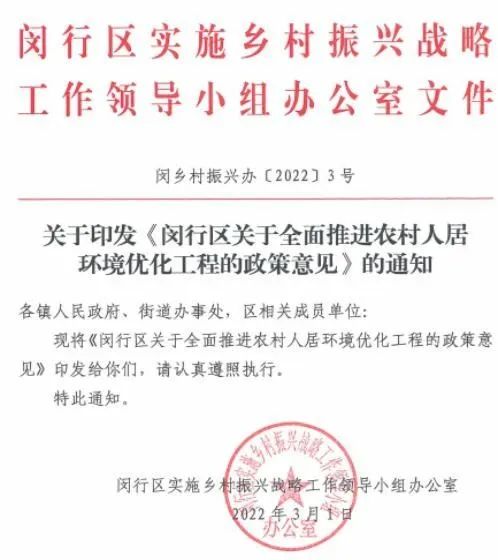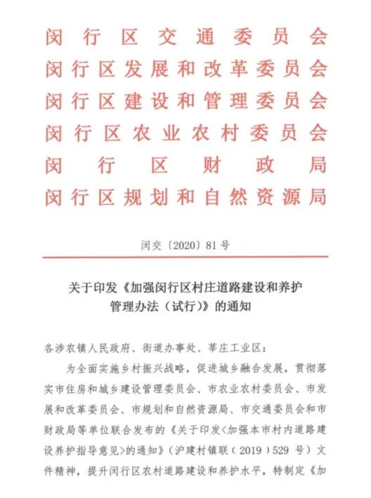 2020年4月为全面实施乡村振兴战略,促进城乡融合发展,切实加强本区村内道路的建设和养护管理,闵行区交通委联合区发改委、区建管委、区农业农村委、区财政局、区规划资源局出台了《加强闵行区村庄道路建设和养护管理办法(试行)》,进一步明确了村内道路建设和管理的相关要求,给8个涉农街镇提供了有力的指导。2021年3月闵行区委办公室、区府办公室印发《黄浦江两岸公共空间建设工程等民心工程实施方案》,进一步明确了农村人居环境优化的具体工作要求和时间节点,明确加快推进村内破损道路、沿线破损桥梁基本达标改造工作要求,为闵行区农村人居环境优化和村内道路建设提供了有力的政策保障。二、积极落实村内道路建设养护资金