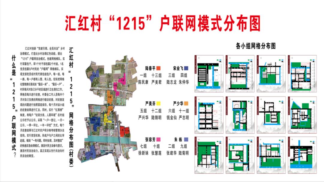浦江镇汇红村创新“党建引领、全员共治”乡村治理模式,提出“1215”互联网自治模式,创建网格梯队,实行双联包干,即1个村干部包联2个村组、1名党员包联5户村民的“户联网”自理模式,实现支部党员或村民代表包组包户,每一组、每一路、每一户都有人管、有人包,切实把村内道路管理责任落实到“最后一米”“最后一户”,达到长效管理和示范带动的良好效果。
