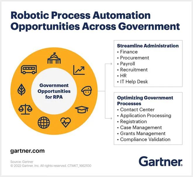 在另一份报告中,Gartner预计到2024 年,75%的政府将启动或实施至少三项超自动化计划,而RPA是实现数字现代化的关键组成部分。