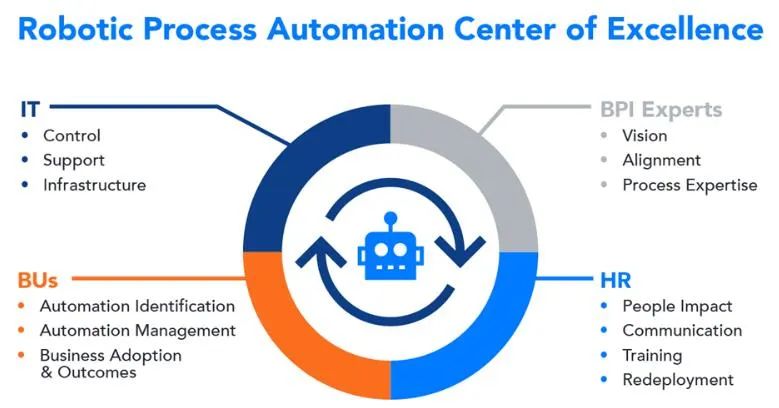 RPA卓越中心(RPA CoE,RPA Center of Excellence),使用RPA工具和技术经验来识别和管理RPA项目的实施。建立 RPA CoE 有多种好处,比如提高机器人开发周期的效率,以及将 RPA 与 IT 集成等,同时还会提供 RPA 培训、服务和支持。