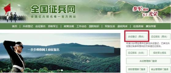 在全国征兵网页面,点击“兵役登记(男兵)”。(男兵在应征报名之前,要先完成兵役登记。)