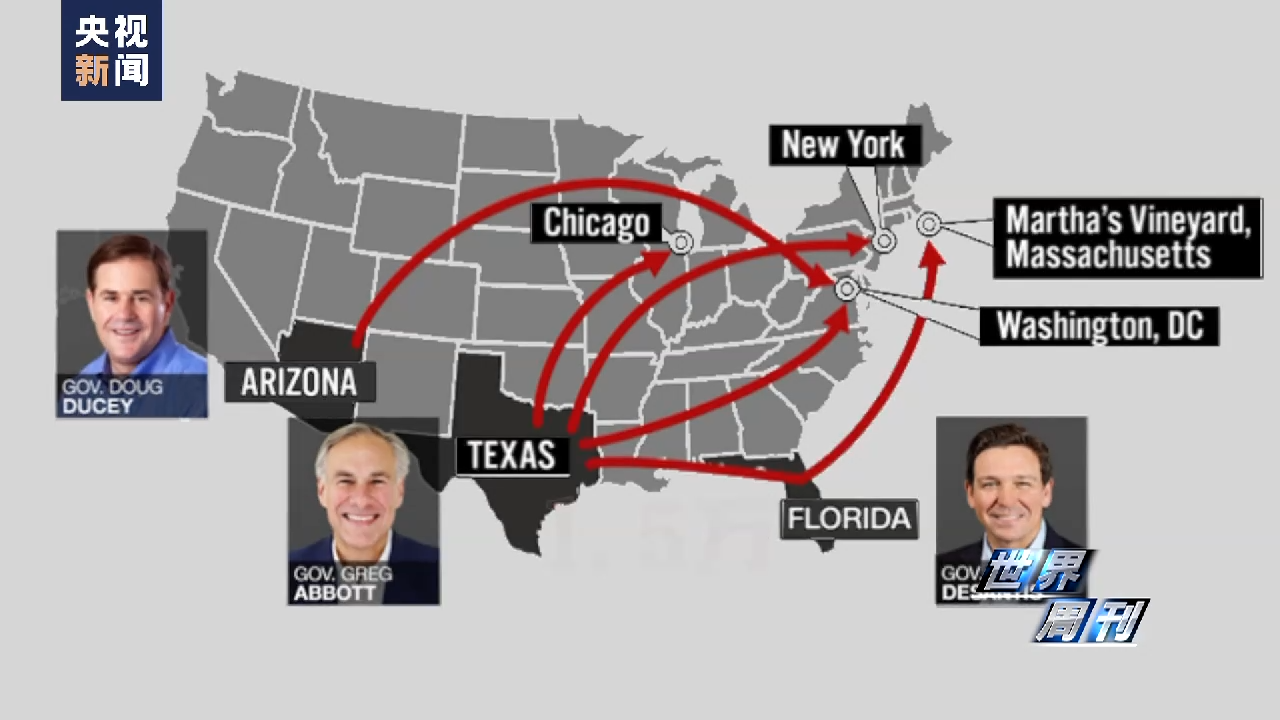 2022年,移民问题成为了民主和共和两党政客争斗的焦点之一。仅得克萨斯州一个州,就在这一年向华盛顿、纽约、芝加哥等民主党主政的城市送去了约1.5万名边境移民。而佛州、亚利桑那州等共和党州也纷纷效仿。