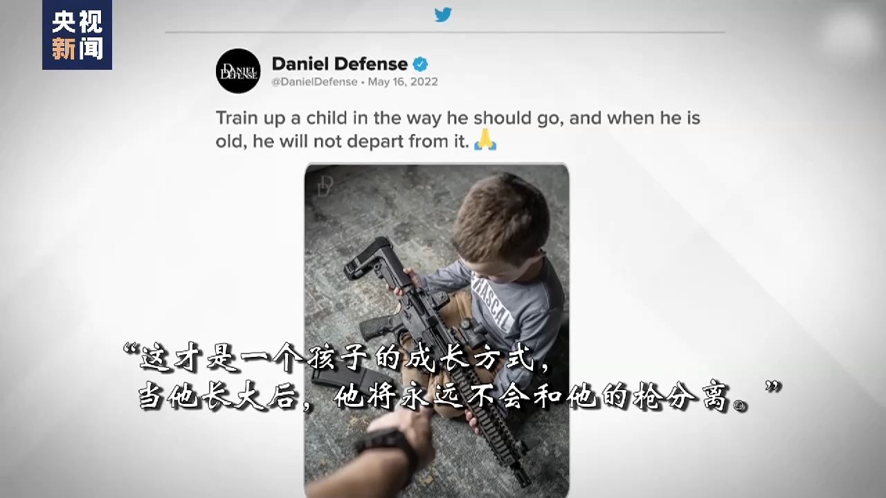 2022年5月,美国枪支制造商在社交媒体上发布的一条广告引发争议。一个男孩手持一把AR-15突击步枪。广告配文称:“这才是一个孩子的成长方式,当他长大后,他将永远不会和他的枪分离。”