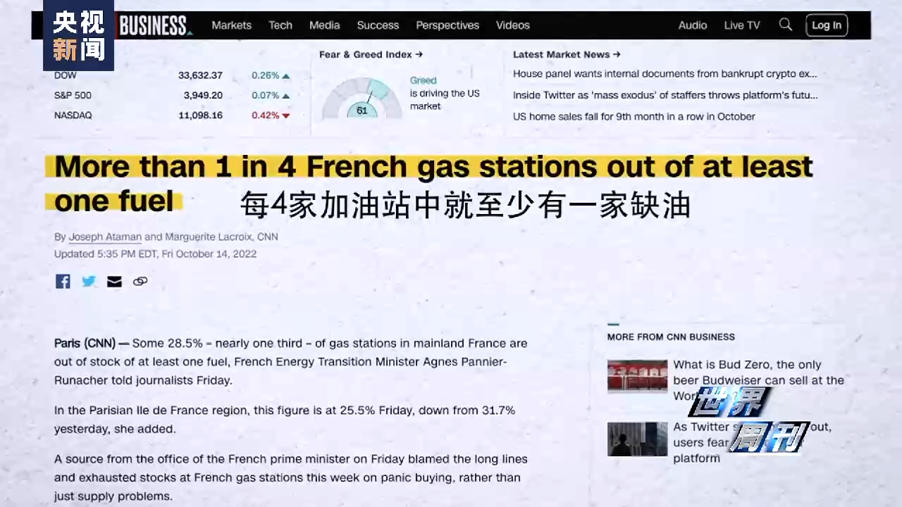 最新民调显示,73%法国受访者认为2022年对法国来说是糟糕的一年。随着俄乌冲突持续,能源危机不断加剧。10月,法国人发现给汽车加油也变得困难起来,每4家加油站中就至少有一家缺油。