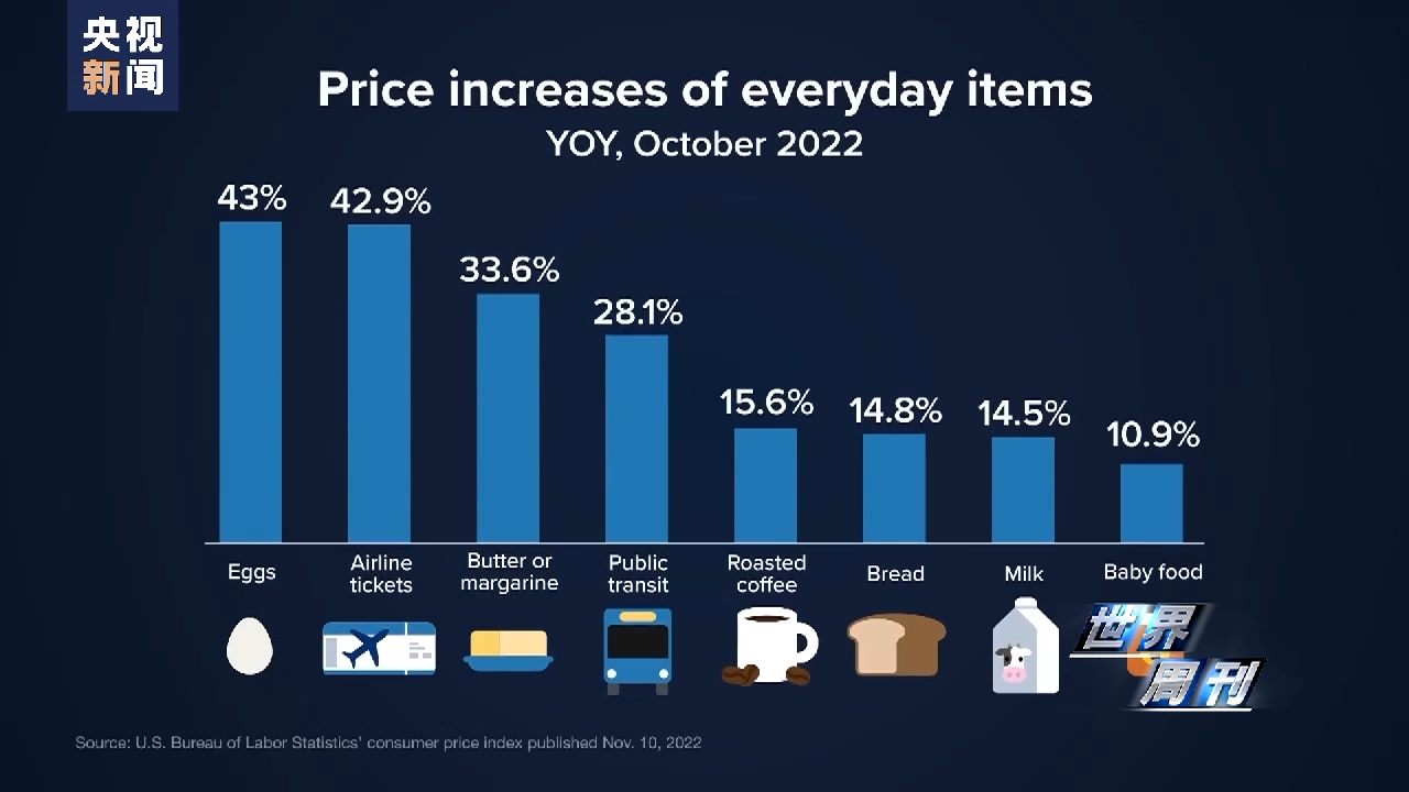 2022年,美国遭遇了近40年来最严重的通货膨胀,消费者价格指数持续增长,日常必需品涨价明显。其中,鸡蛋价格上涨高达43%,机票上涨42%,黄油上涨近34%,公共交通费用上涨约28%。