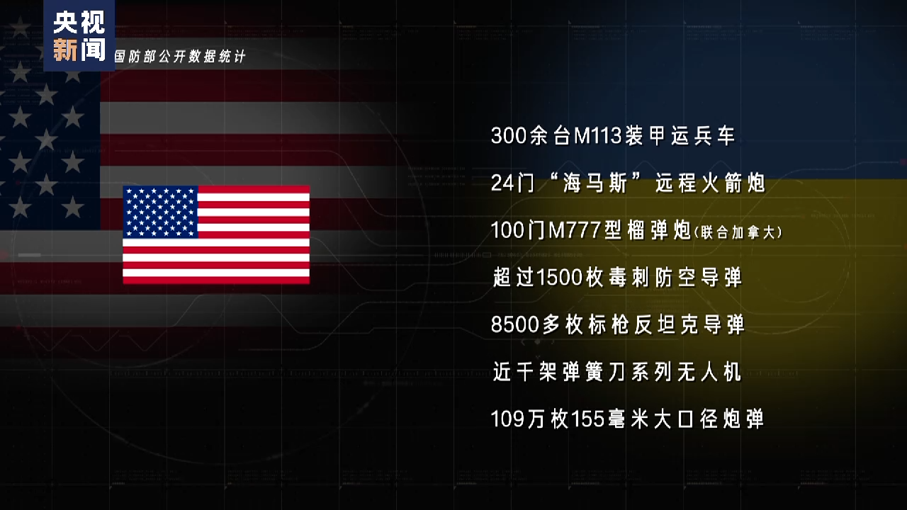 仅从美国国防部公开数据统计,一年来,美国向乌克兰提供了300余台M113装甲运兵车,24门“海马斯”远程火箭炮,联合加拿大提供100门M777型榴弹炮,美国提供超过1500枚“毒刺”防空导弹,8500多枚“标枪”反坦克导弹、近千架“弹簧刀”系列无人机,累计向乌克兰援助了109万枚155毫米大口径炮弹,几乎把库存清空。