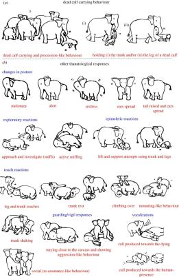 而在一项今年的研究中,研究者收集了视频网站上,大象们目睹同类死亡时的场景。它们表现出了不安、静止和警觉的姿势,也会触摸,会嗅闻,会摇动尸体,会发出声音,母象会抬起自己死去的孩子,象群会包围着尸体守夜。总而言之,大象是具有死亡意识的动物,它们知道自己同伴的死亡。