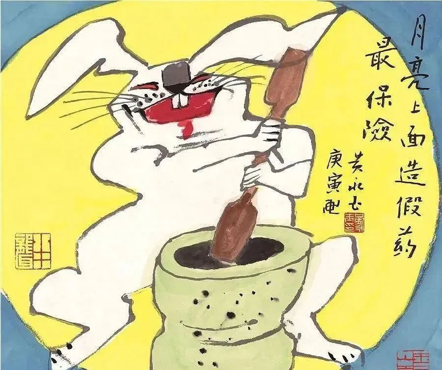 传统的玉兔捣药,经过他手,变成了张着血盆大口的兔子。